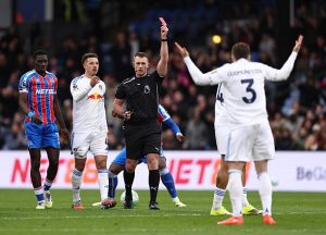 LONDON, ENGLAND – MARCH 15: Referee Thomas Bramall shows a red card to Gabriel Gudmundsson of Leeds United during the Premier League match between Crystal Palace and Leeds United at Selhurst Park on March 15, 2026 in London, England. (Photo by Alex Pantling/Getty Images)