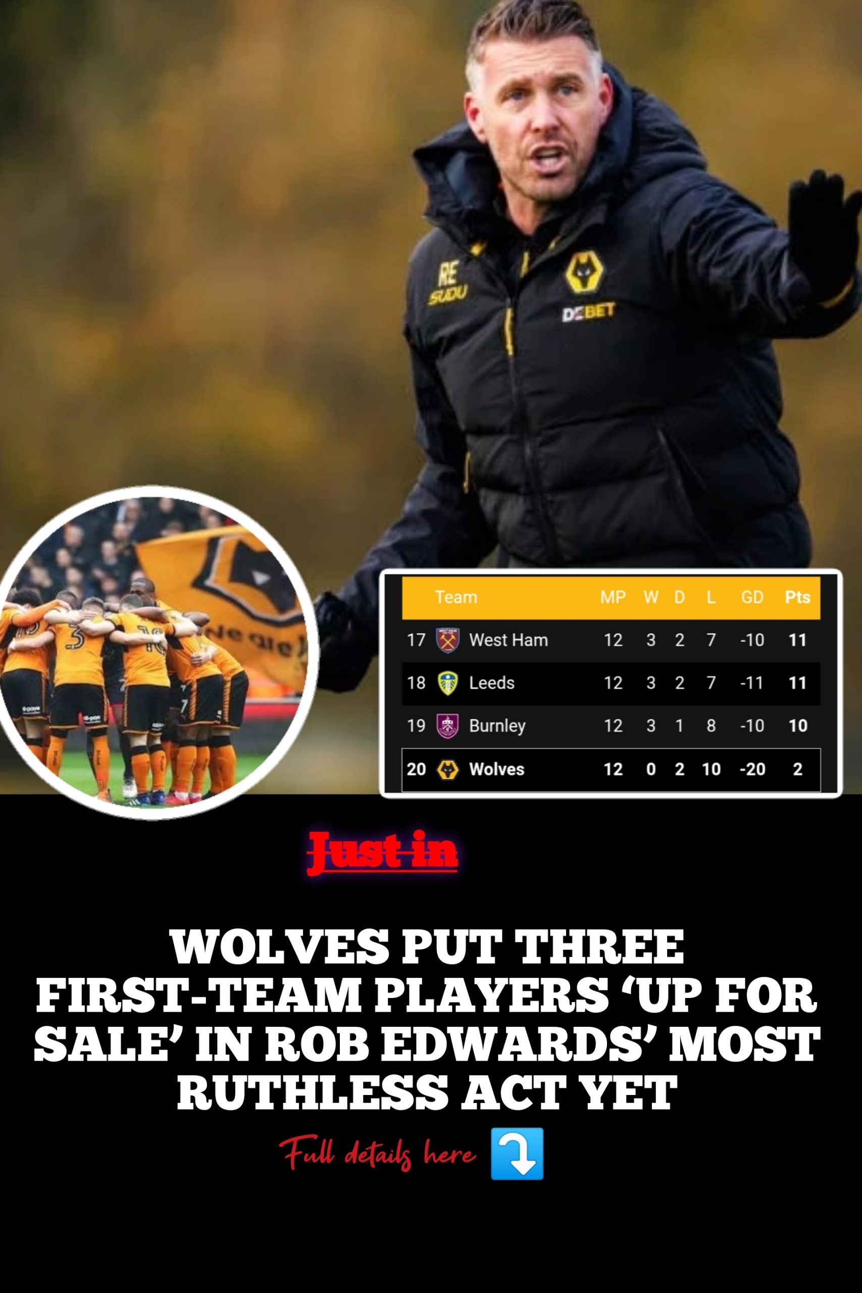 Wolves manager Rob Edwards has taken his boldest step yet in reshaping the squad by placing three senior first-team players on the transfer list ahead of the January window. The move marks a significant shift in approach under the new head coach, who has made it clear behind the scenes that standards must rise swiftly if the club is to regain stability during the second half of the Premier League season.